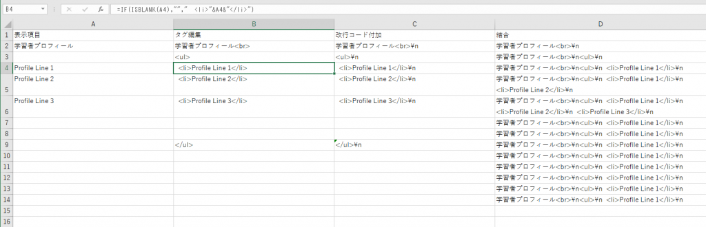 I enter the contents of the smart evidence item on the Excel worksheet, use the string combination function, add tags and line feed codes, and paste it into the JSON sample.