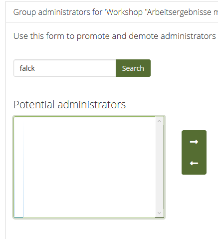 we want to add group administrators with the administration menu -> Administer groups. It doesn't work. With entering a name in the search box and click on search, there aren't appear names in the list. So we can't add administrators. You only see there's something change (see on the picture) but no names...