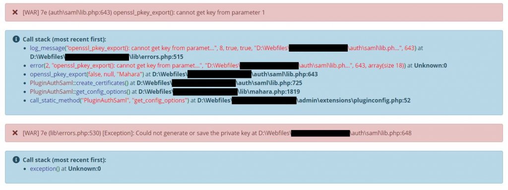 [WAR] 98 (lib\errors.php:530) [Exception]: Could not generate or save the private key at D:\Webfiles\maharatest.domainname.ac.uk\auth\saml\lib.php:648
