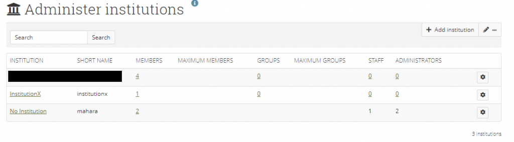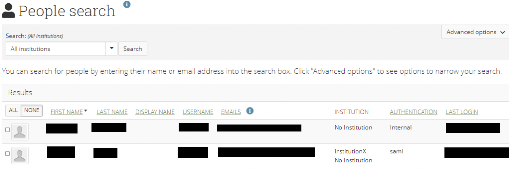 - Admin menu → People → People search page (again, without names and email addresses) to show in the institution column that people are in both 'No institution' and another institution?