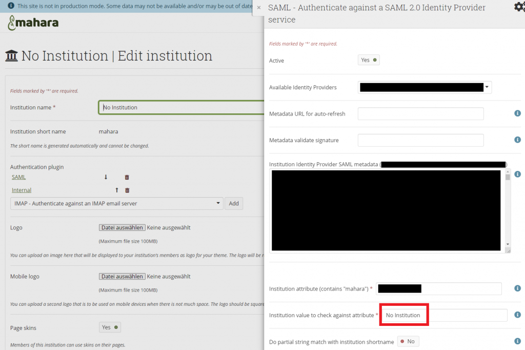 I didn't change much in this new Mahara instance. I just created some users and institutions. In "No institution" I configured SAML authentication with our Shibboleth IDP. I logged in per SAML with one user and after that I added this user to another institution as an admin. From now on this user is in "No institution" and another institution at the same time.