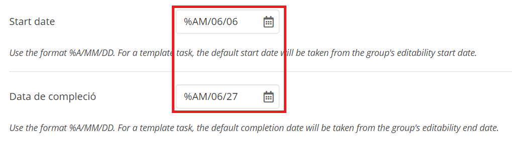 As for the date field that looks like the date format is not correctly expanded for Catalan. In English it says 'Use the format %s' and the '%s' then shows the correct date format for the selected language, e.g. in German it says 'Verwenden Sie das Format YYYY/MM/DD'. However, in Catalan it displays 'Use the format %A/MM/DD' (because the string hasn't been translated) instead of AAAA/MM/DD. I don't know why that would be. A developer would need to take a look and see what's going on there, if it's an issue in the translation setup, if PHP doesn't know the proper format or ...