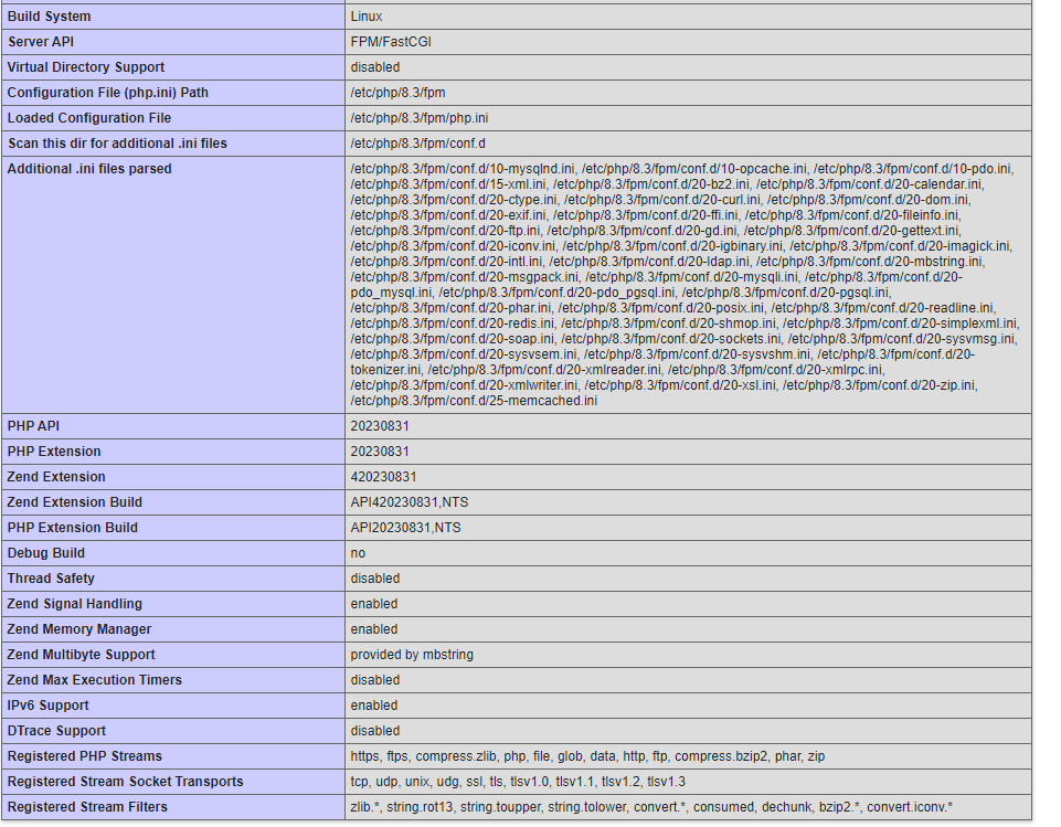 Relating to Doris's question about apache php matching php cli ive attached a screenshot of some of the phpinfo. as much as our security team would let me. it does appear to be using 8.3 but as i said above we have 2 versions of PHP installed on the server and php -v returns 7.4 you have to envoke php8.3 -v to get its version not sure if that makes a difference
