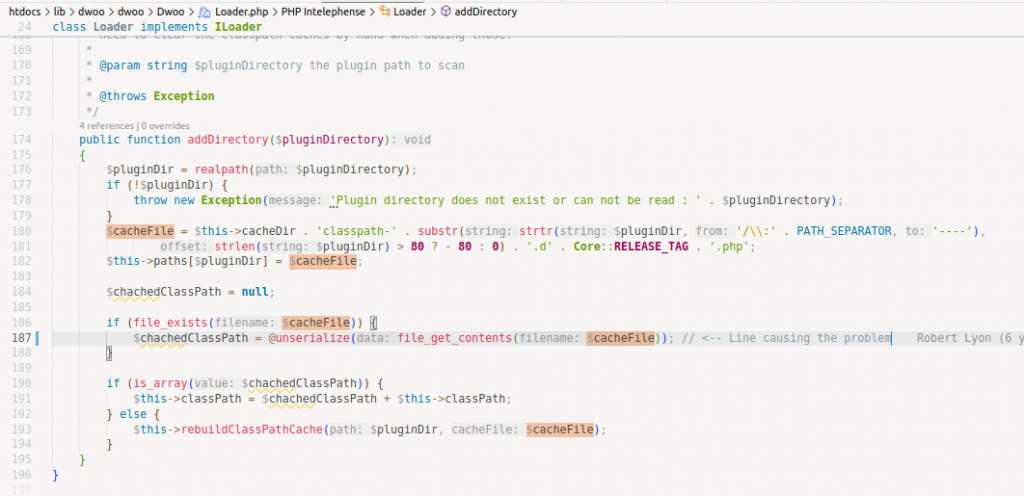 By adding extra code in the file 'htdocs/lib/dwoo/dwoo/Dwoo/Loader.php', at line 187, above $chachedClassPath = @unserialised(...): log_debug($cachedFile);