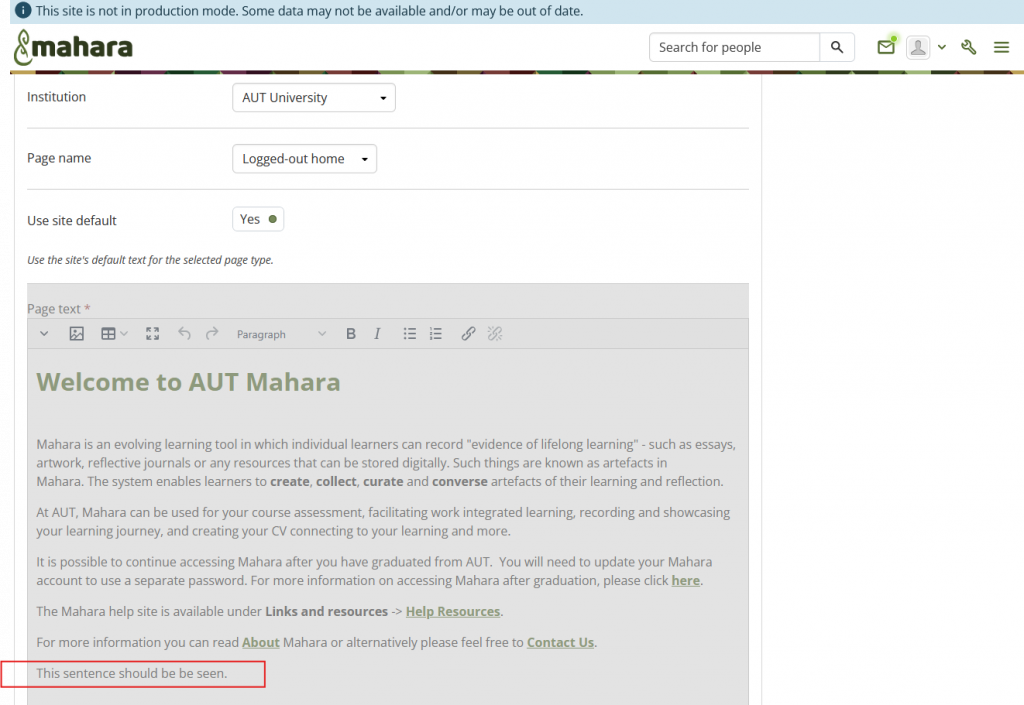 This sounds like the bug that was fixed by a community member and will be rolled out in Mahara 26.04. You can backport it to your Mahara 25.04 if you want to use it now or copy and paste the content from the site static page for the time being.