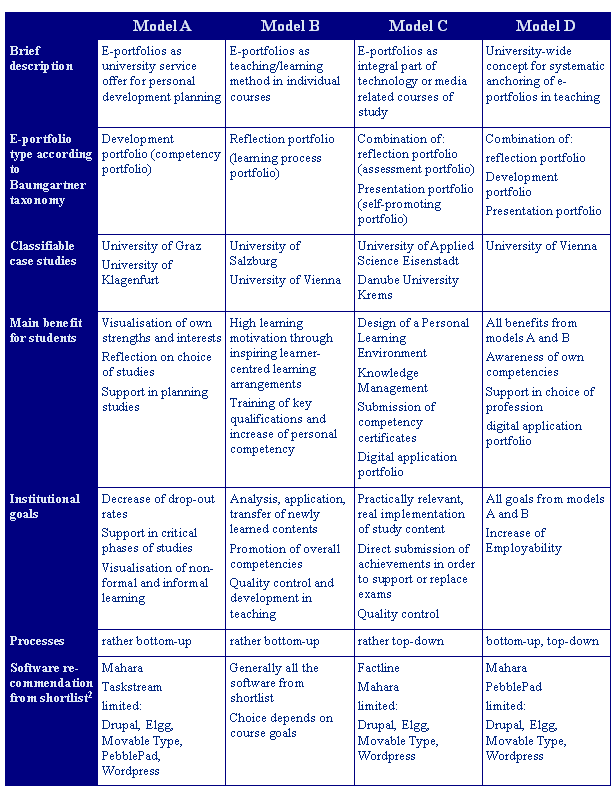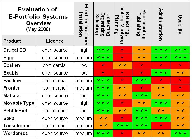 Mahara and PebblePad represent the most balanced products, which can be used for portfolio work without huge time expenditure for installation. Both systems require some acclimatization effort but – once their logic is clear – they are easy to handle. However, it has to be said that by abstaining from traditional structures of homepages (e.g. menu navigation, data management), PebblePad cuts its own idiosyncratic path. As “learning suites“ Sakai, Taskstream and Fronter offer, in addition to an E-Portfolio tool, various other tools to support teaching and learning processes; that is why they might under certain circumstances be interesting for institutions which want to install a learning platform as well. Wordpress, Drupal ED, Elgg and Movable Type are completely different software types, but they can definitely be used for the purpose of portfolio work. Although they all require a relatively high adaptation effort at first time installation, they have the advantage, that they represent successful open-source projects with a huge and active community. They are the best available technology and offer individually configurable solutions through various plugins. The Factline Community Server also offers the user individual solutions. But by employing a very particular concept, the software is not easy to handle for newcomers and certainly requires a much more intensive study. Exabis provides Moodle users with an easily operated and structured data pool with an export function, which is hardly offered by any other tool. On the other hand, Exabis shows serious weaknesses concerning the support of portfolio processes, especially in regard to the design of a presentation portfolio. Epsilen is a simple and clearly arranged system, which offers support for designing an E-Portfolio as a personal homepage. But at the same time it is also highly inflexible; the scope for design is very limited and the technology is partly antiquated, which calls for the further development of the software.