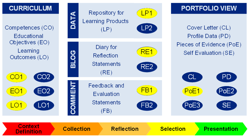 Model C is based on the E-Portfolio implementation at the study course "eEducation, MA". The virtual environment uses a bundle of tools and technologies, the most important are Moodle as LMS, Media Wiki for collaboration and Mahara. The following figure shows how the students use Mahara to create portfolio views for assessment: